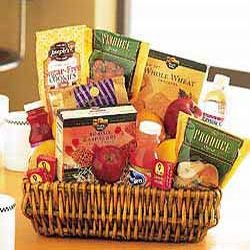 This deliciously healthy basket of fruits, crackers and juice makes a perfectly wholesome gift. Great for all kinds of acknowledgments. Fresh fruits, along with crackers, cookies, juice and water, are delivered in a wicker basket suitable for keeping.